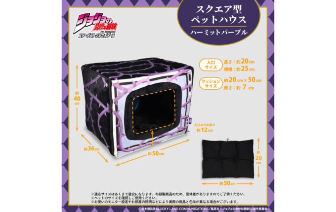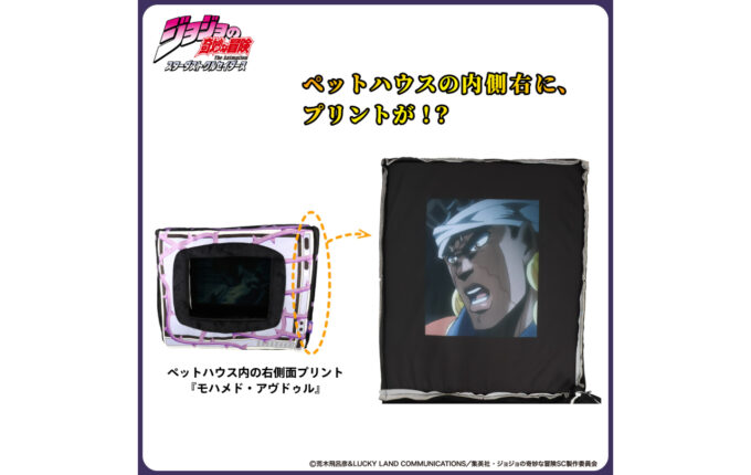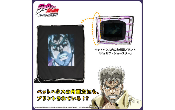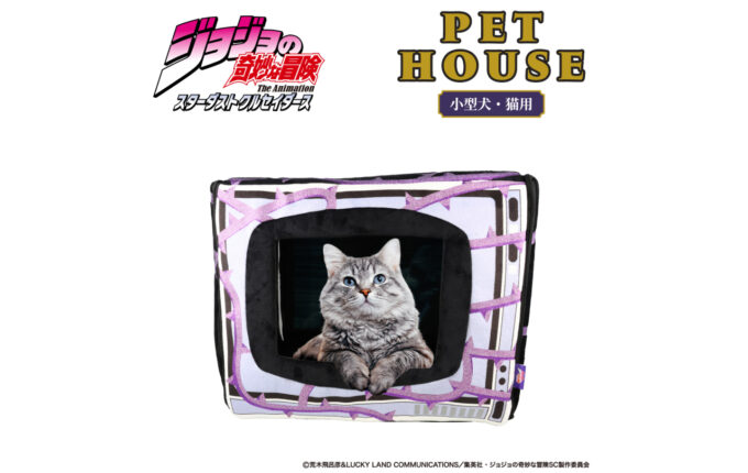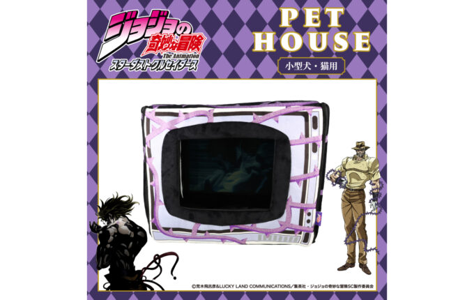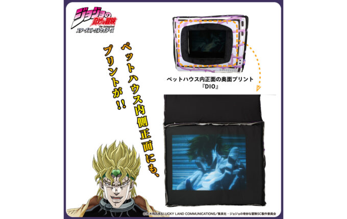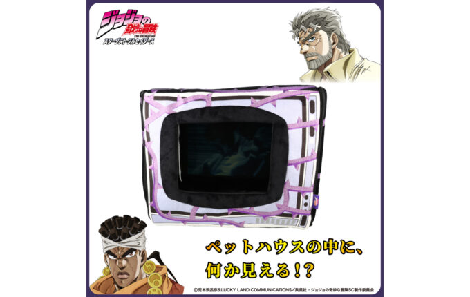 アニメ『ジョジョの奇妙な冒険 スターダストクルセイダーズ』からペットハウスが登場! 『ジョセフ・ジョースター』のスタンド『ハーミットパープル』を使ってTVにDIOを念写するシーンをペットハウスで再現!! スクエア型のTV型ハウスの中には『DIO』『モハメド・アヴドゥル』『ジョセフ・ジョースター』をデザイン