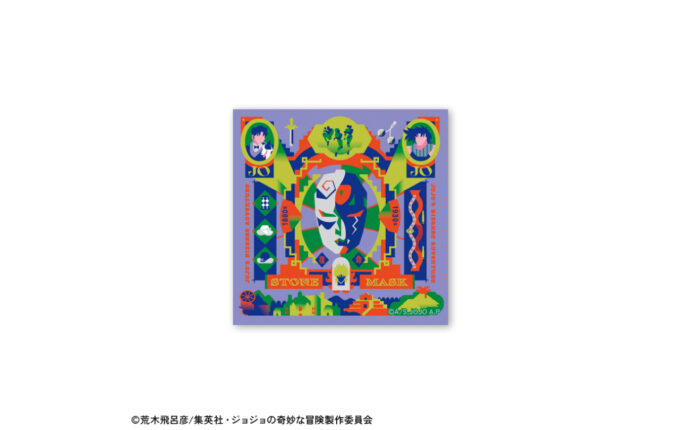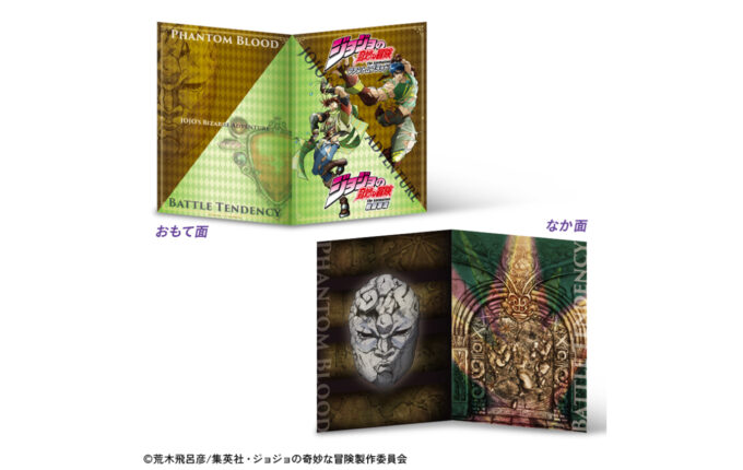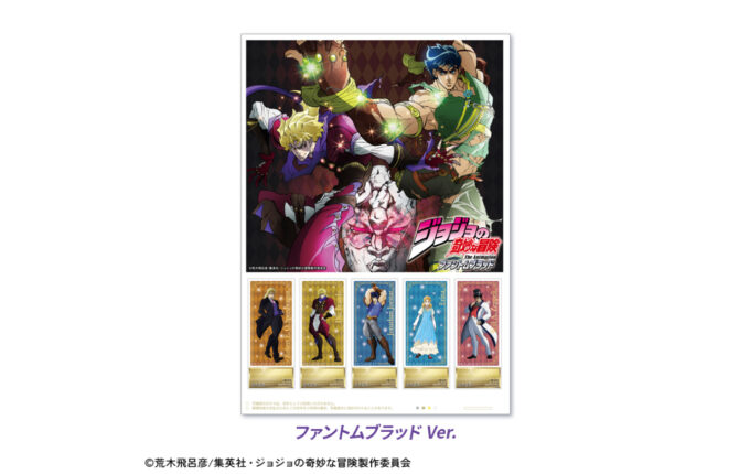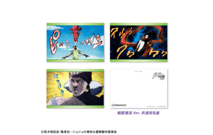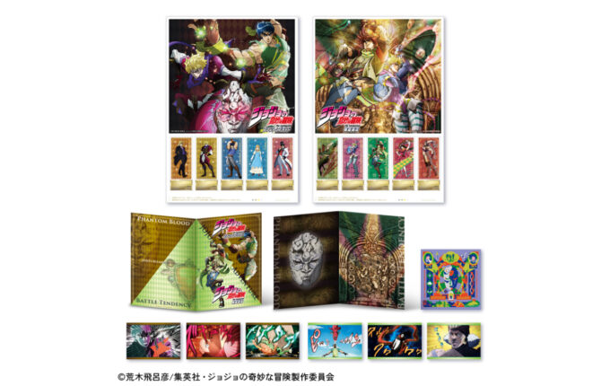 ジョナサン、ディオ、ジョセフ、シーザーなどが登場するフレーム切手に擬音シーンにフォーカスしたポストカード、オリジナルアートステッカーがついたセット商品です。