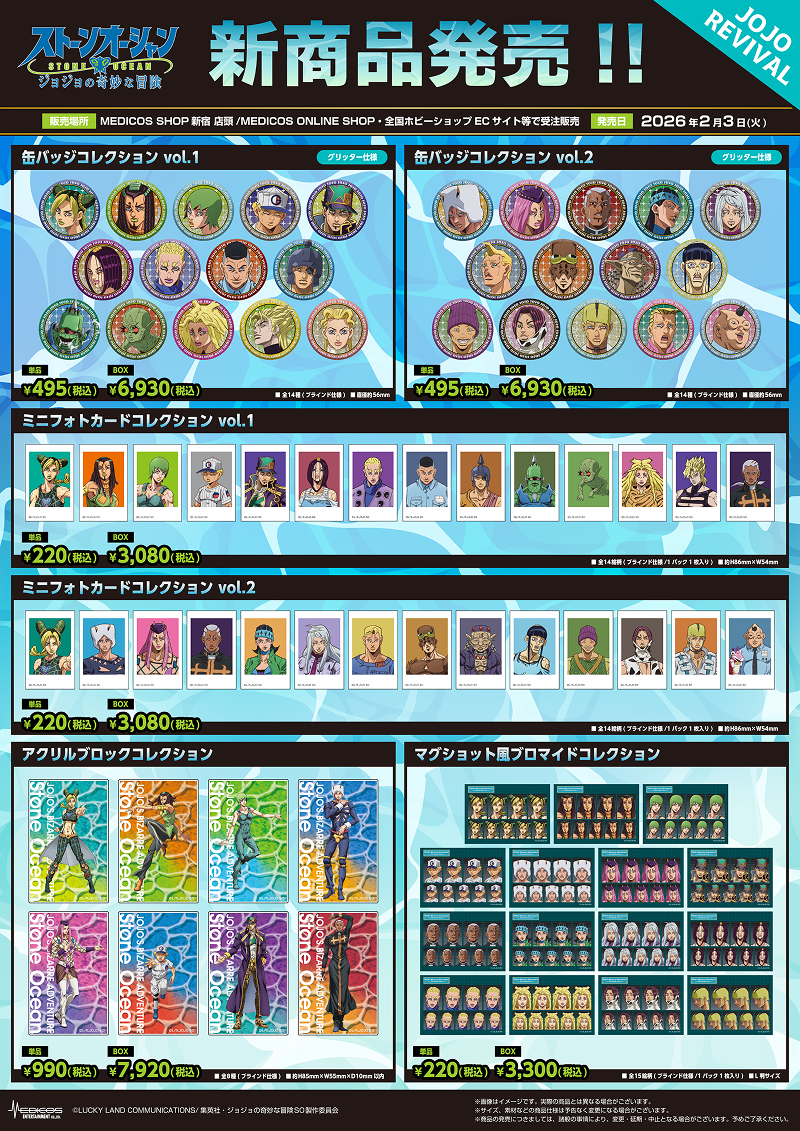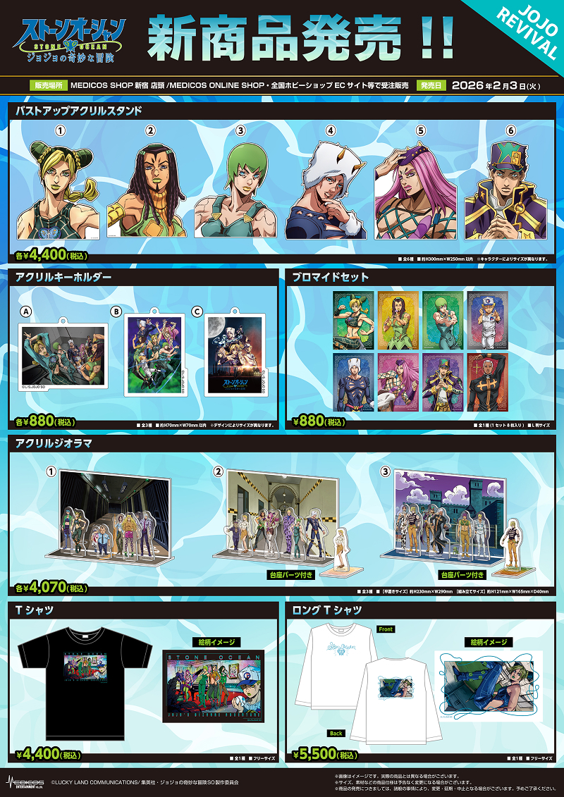 情報の追加・更新は、当ページおよびX「メディコス・エンタテインメント_ジョジョ」にてご案内いたしますので、ご来場の際はご確認の程お願い申し上げます。