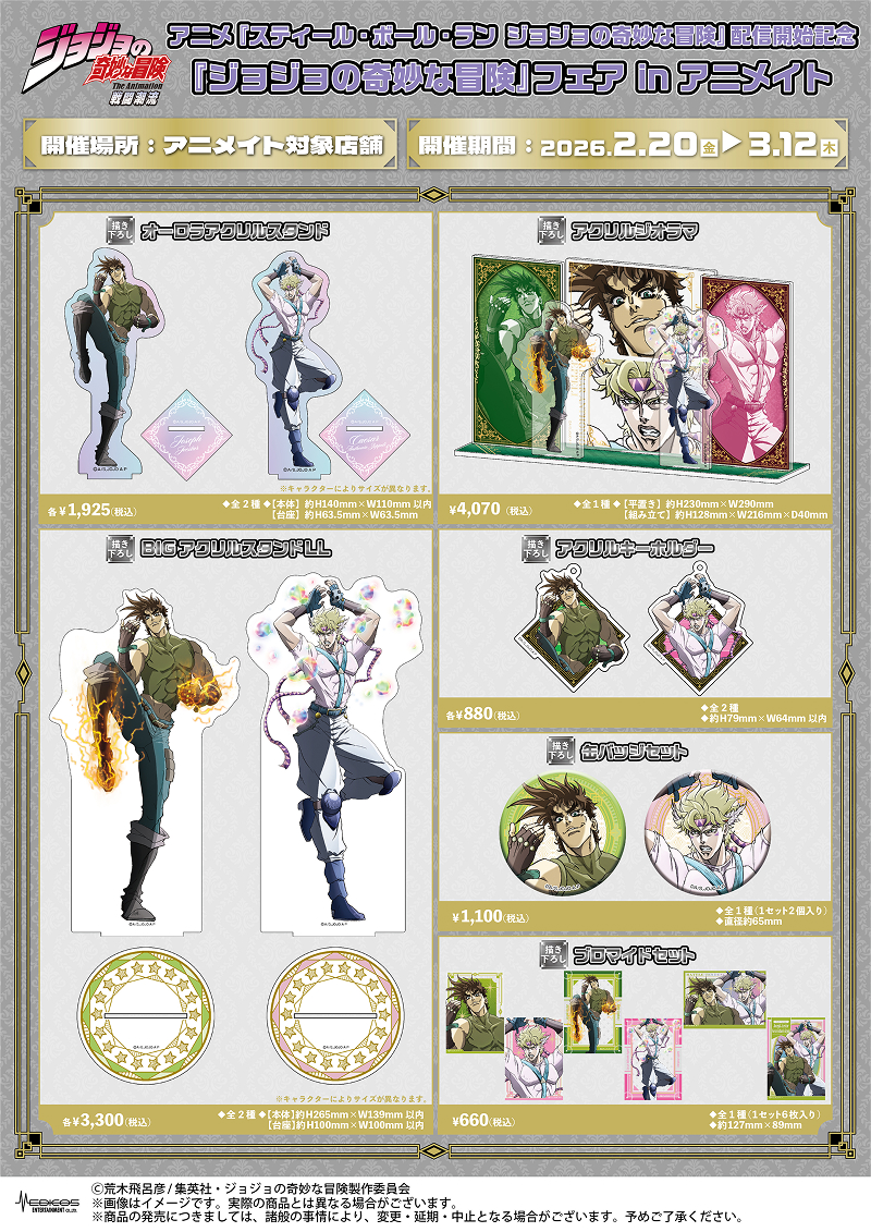アニメ『スティール・ボール・ラン ジョジョの奇妙な冒険』配信開始記念『ジョジョの奇妙な冒険』フェア in アニメイトで販売した商品はMEDICOS ONLINE SHOPにて事後通販を予定しております。