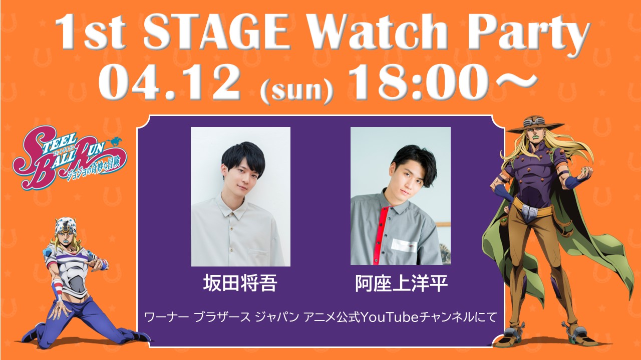 ジョニィ・ジョースター役の坂田将吾さんと​ジャイロ・ツェペリ役の阿座上洋平さんによる、1st STAGEのウォッチパーティーを生配信で​開催決定!